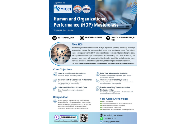 Human and Organizational Performance Masterclass ๐ค Organized by: MICCI ๐ 15 – 16 April 2026 ย ๐ Venue: Crystal Crown Hotel, Petaling Jaya As organisations strive for safer and more reliable operations, managing human error and strengthening system performance has become a critical priority. Human and Organizational Performance (HOP) provides a practical approach to improving […]
