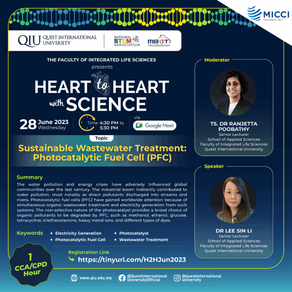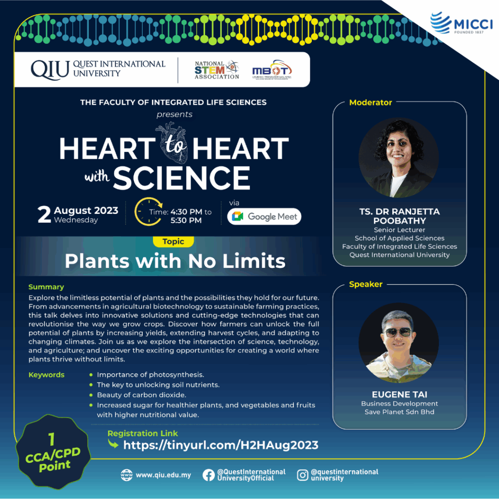 [QIU Webinar] Heart To Heart With Science 📅: Aug 2, 2023 – Aug 2, 2023 Our member, Quest International University (QIU) is organising a “Heart To Heart With Science” webinar, details as below: Topic: Plants With No LimitsDate: 2nd August 2023, WednesdayTime: 4.30pm – 5.30pmPlatform: Google MeetRegister at: tinyurl.com/H2HAug2023 Explore the limitless potential of plants and the possibilities […]