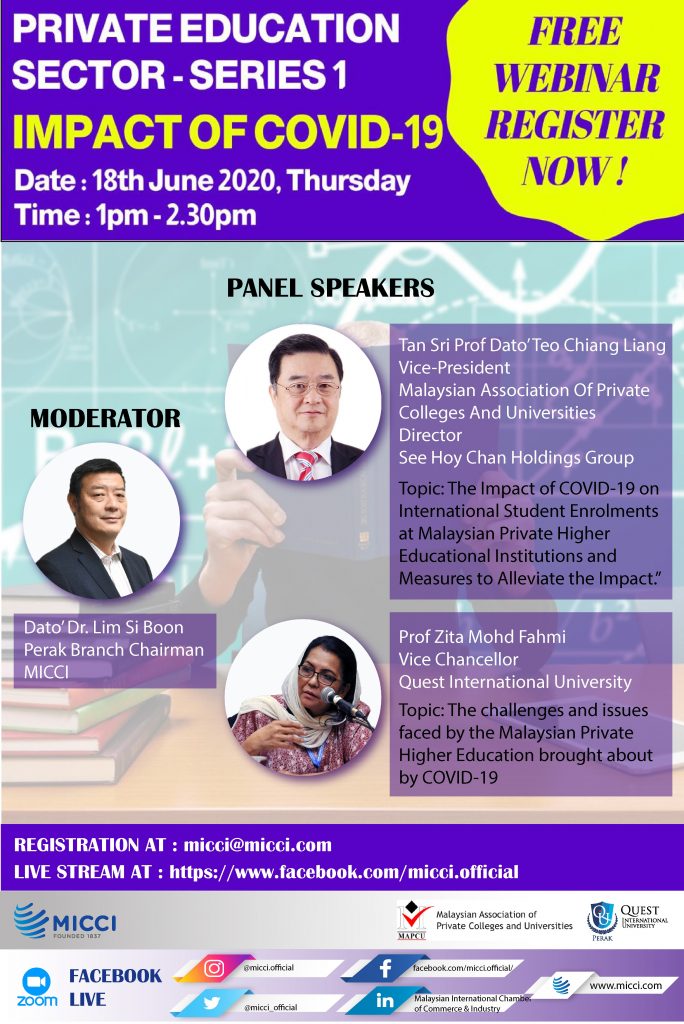 Private Education Sector Impact Of Covid-19 Free Webinar By MICCI 👤: By admin@admin.com ⏰: June 15, 2020 With the world-wide COVID-19 lockdown and restricted movements, the education sector, particularly the private education institutions are facing very challenging times in terms of enrolment and adherence to SOPs. Therefore, we are introducing another series of Live Webinar called […]