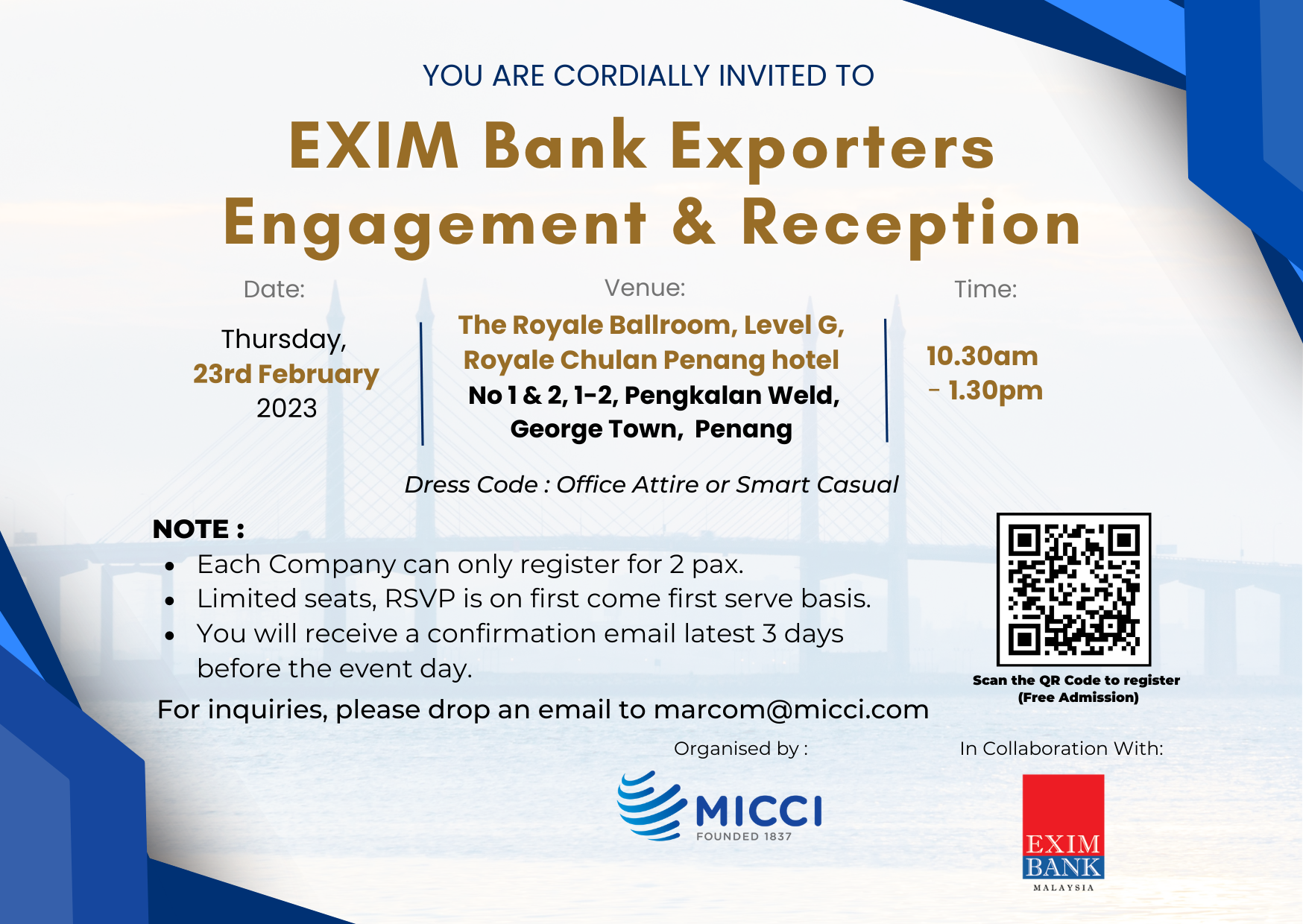 Home » Events » [Invitation] Exim Bank Exporters Engagement & Reception With MICCI Northern Branch (Penang)