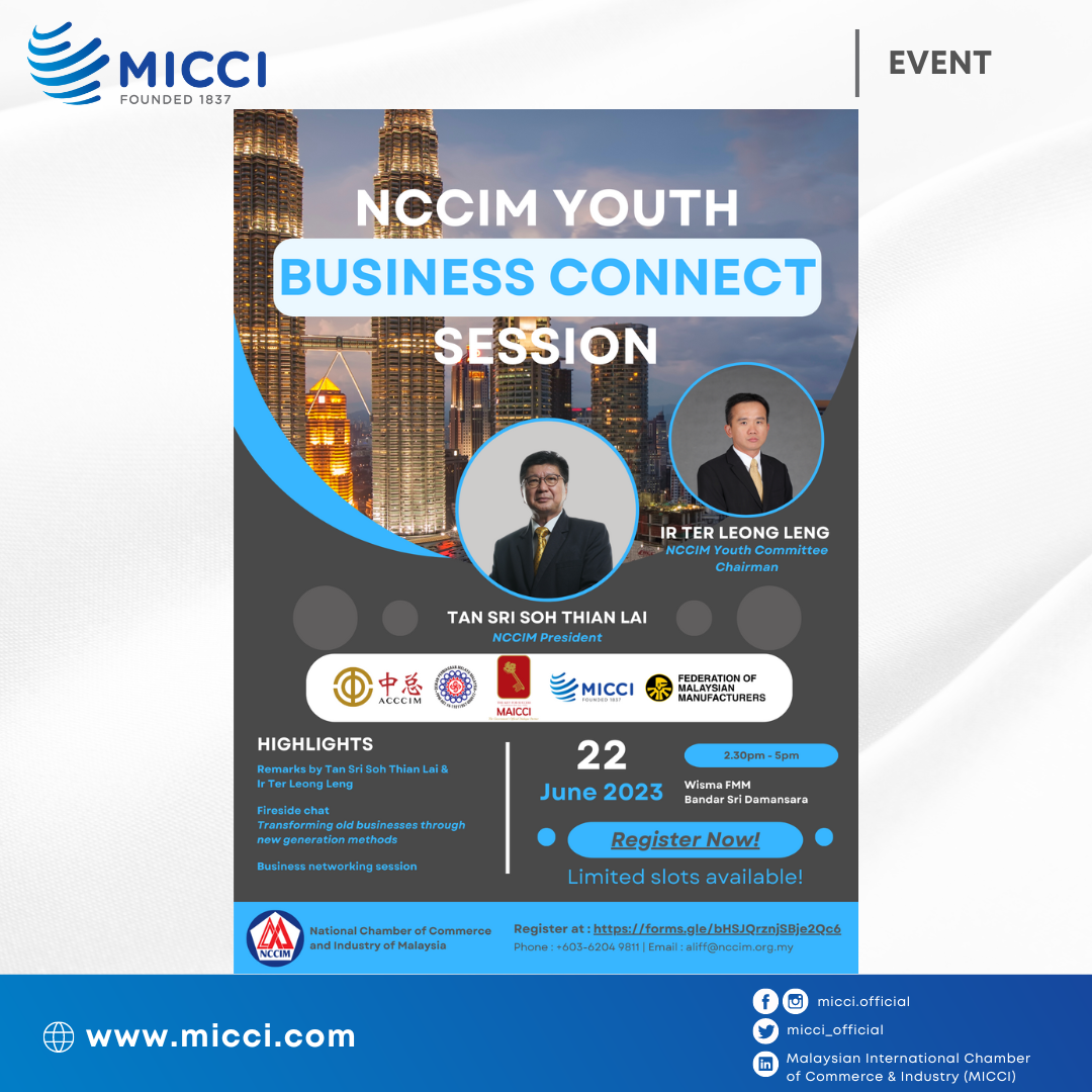 The National Chamber of Commerce & Industry of Malaysia (NCCIM) is organising the NCCIM Youth Business Connect session together with the Top 5 national chamber of commerce.