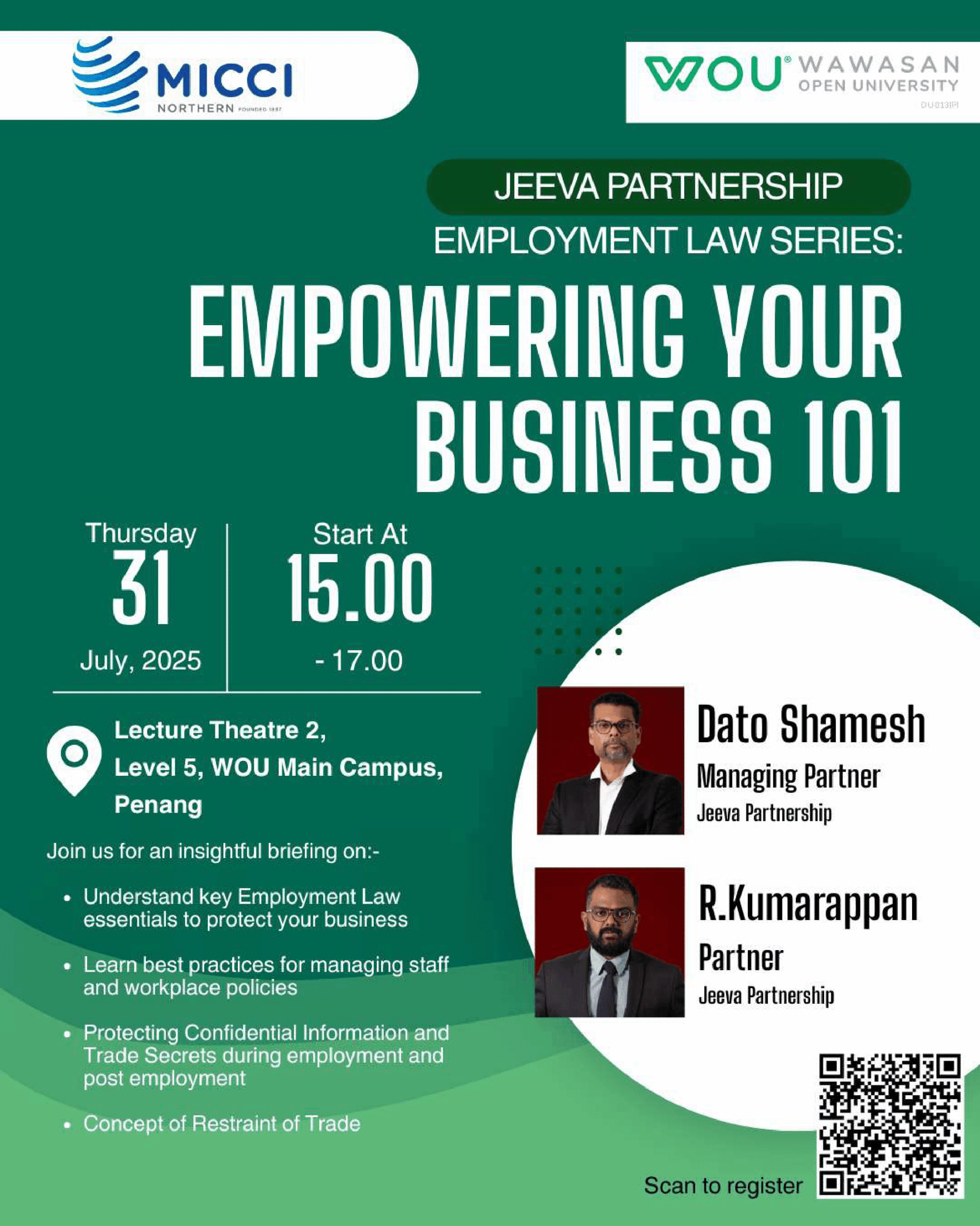 Dear Members, MICCI Northern, in collaboration with Jeeva Partnership and Wawasan Open University, is pleased to invite you to the Employment Law Series: Empowering Your Business 101.