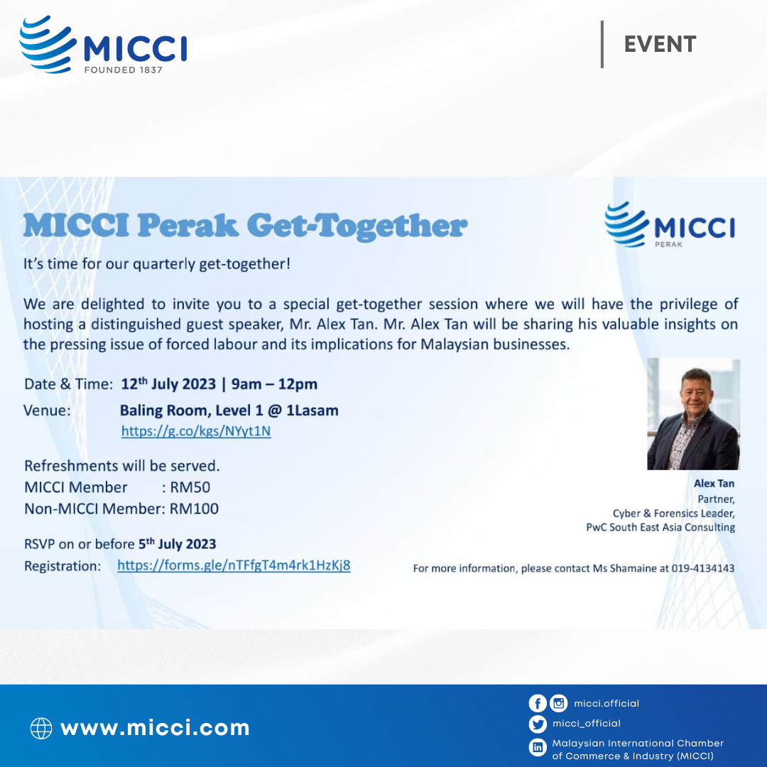We are delighted to invite you to MICCI Perak Branch special get-together session where we will have the privilege of hosting a distinguished guest speaker, Mr. Alex Tan, Partner, Cyber & Forensics Leader of PwC South East Asia Consulting. Mr. Alex Tan will be sharing his valuable insights on the pressing issue of forced labour and its implications for Malaysian businesses.
