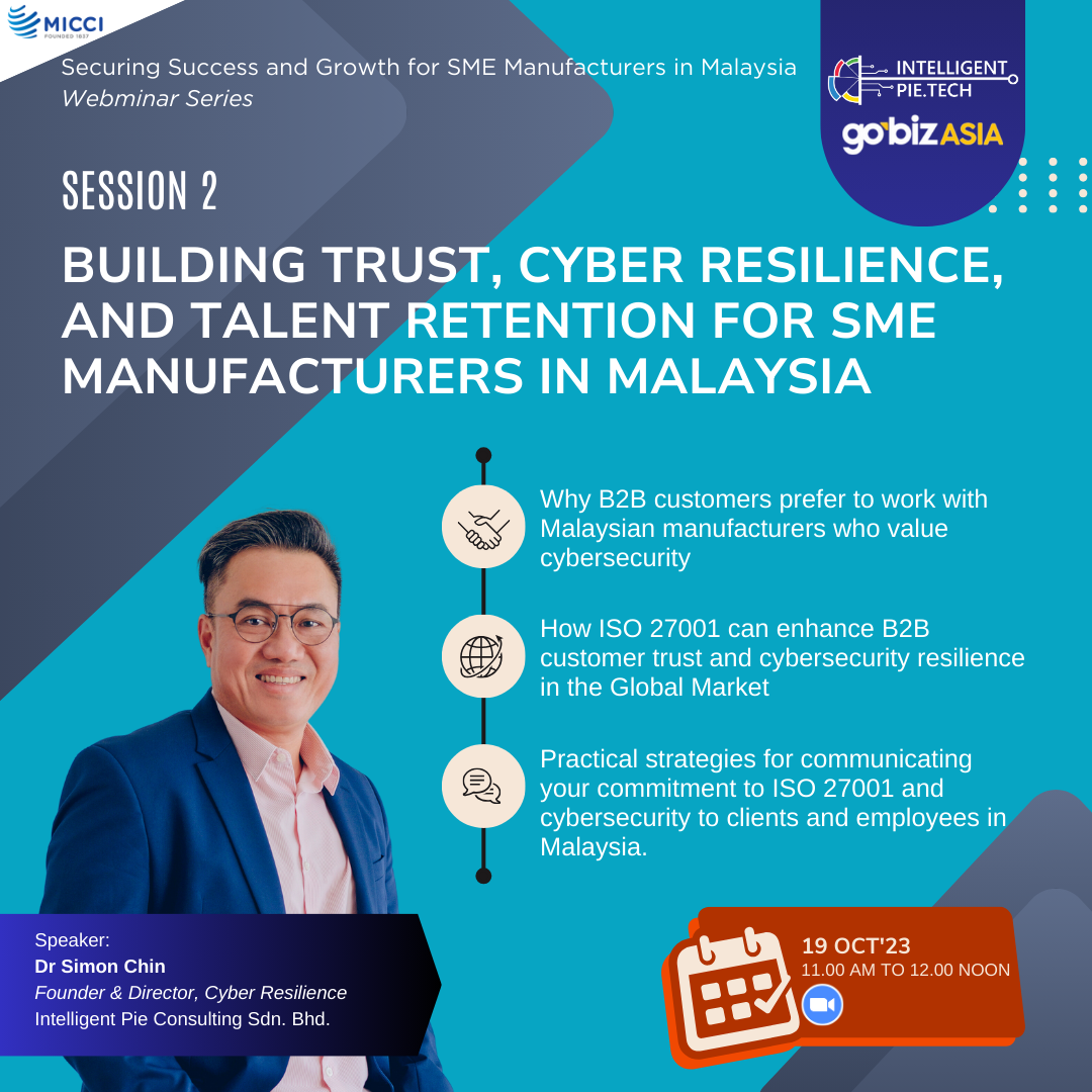 Our member, Intelligent Pie Consulting Sdn Bhd is organising “Securing Success and Growth for Small & Medium Manufacturers in Malaysia: ISO 27001, Cyber Resilience, Business Recruitment, and Retention” webinar series together with MICCI. The webinar details are as below:
